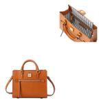 Crisp clean lines of timeless design catches the eye first. A stunning array of rich hues lures one further. Then, the delicate Saffiano texture coupled with contrasting russet leather trim, off-white topstitching, and simple gold tone hardware completes this perfect mixture of tailored, subtle beauty. Three compartments. One zip compartment. Twelve credit card slots. Lined. L 7.75 in. W 1 in. H 4 in.